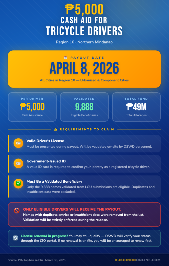 The Department of Social Welfare and Development (DSWD) in Northern Mindanao will release financial assistance to tricycle drivers across the region on April 8, 2026 under its Assistance to Individuals in Crisis Situations (AICS) program. The payout will cover both urbanized and component cities in Northern Mindanao.